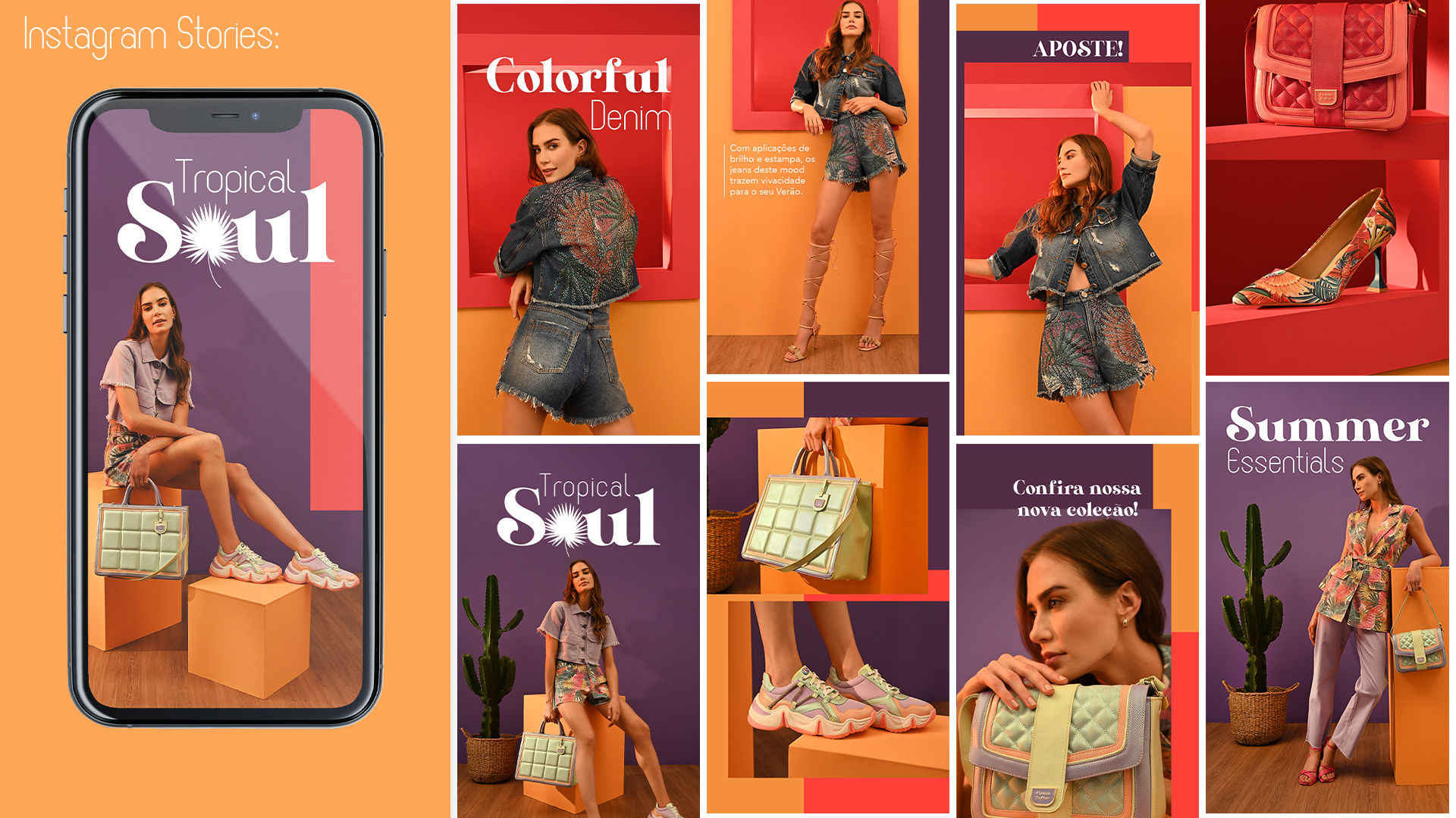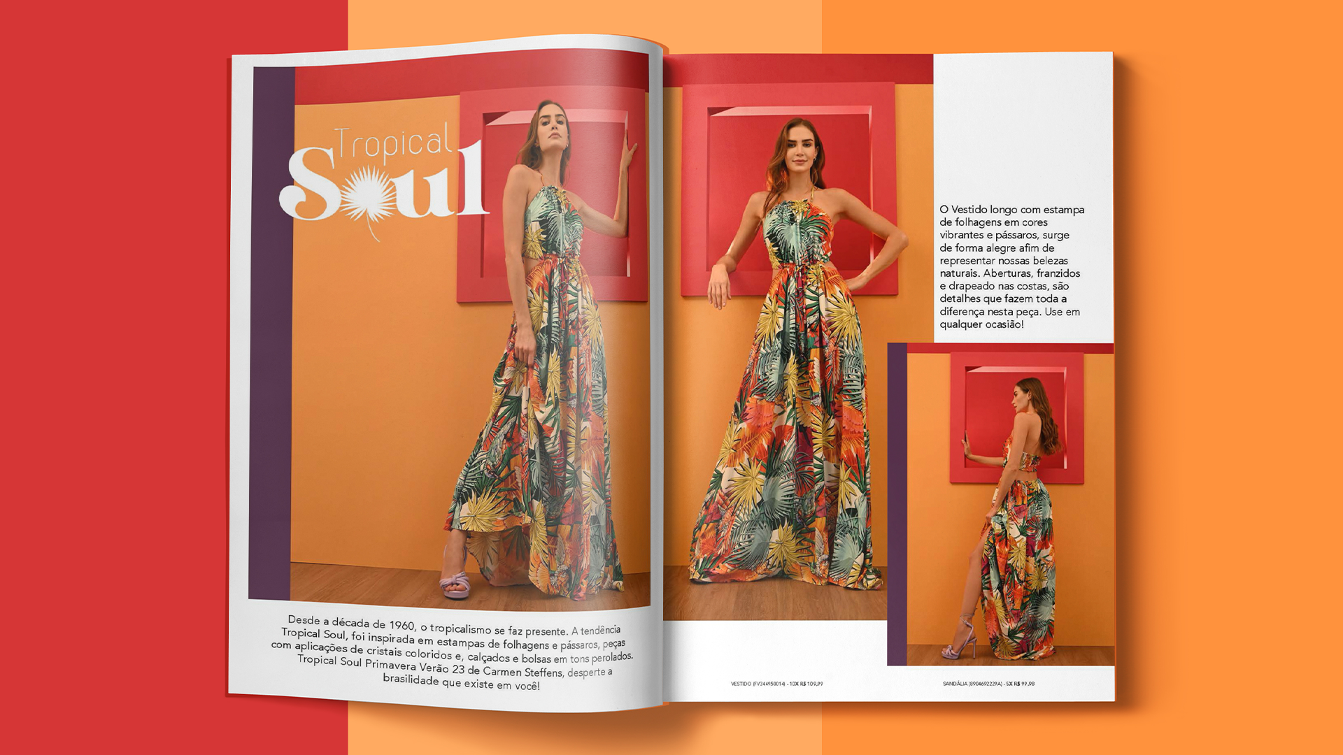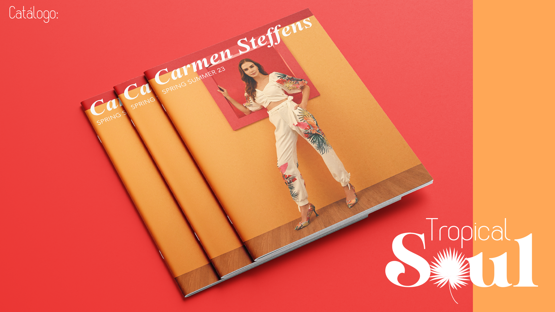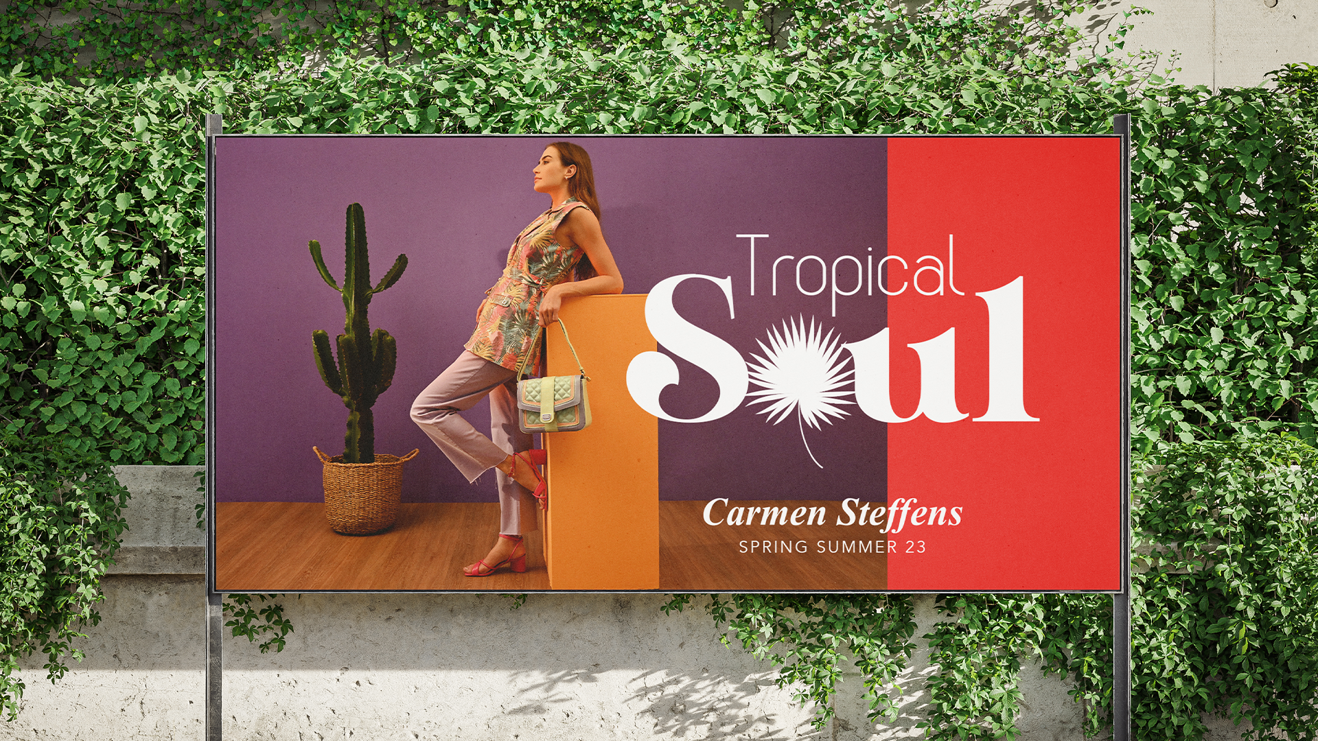 Key visual e demais materiais gráficos desenvolvidos para a Campanha Tropical Soul, Primavera-Verão 23, Carmen Steffens.